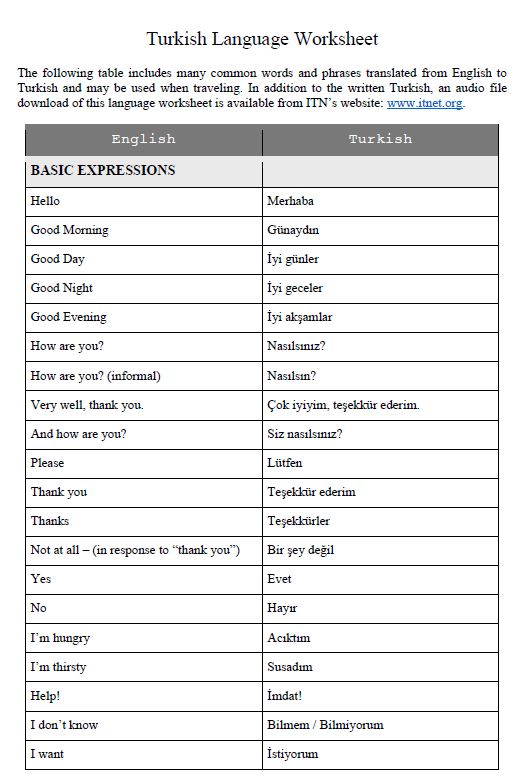 Una tabla de palabras y frases comunes traducidas del español al turco.